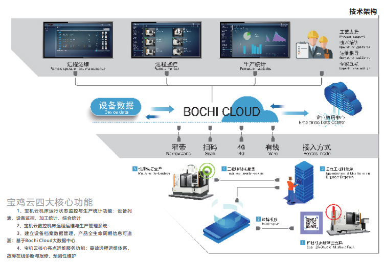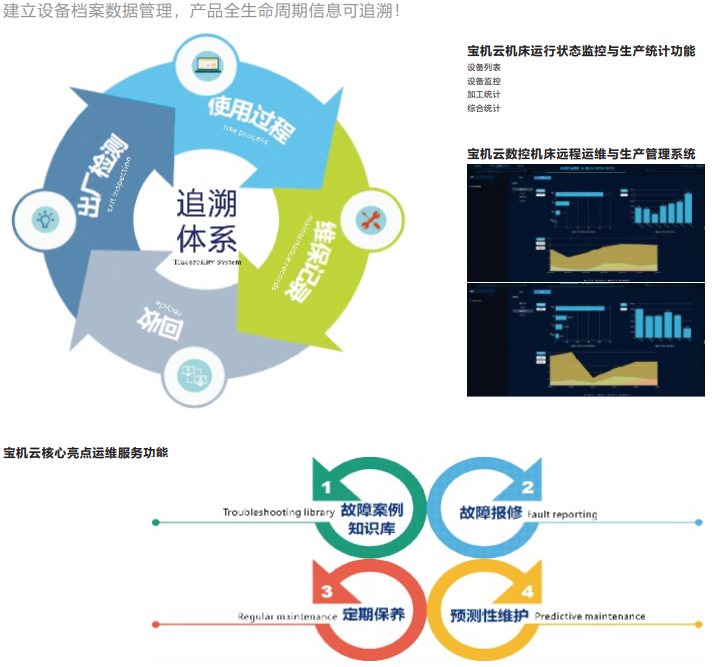 寶機云是寶雞機床數(shù)控機床全生命周期管理服務平臺。寶機云對機床數(shù)據(jù)等進行遠程采集,通過對機床大數(shù)據(jù)的分析和處理,實現(xiàn)基于機床大數(shù)據(jù)、云計算的智能化增值服務。如,面向車間管理人員的機床狀態(tài)和生產(chǎn)數(shù)據(jù)可視化,提高生產(chǎn)管理的便捷和時效;面向用戶設備的遠程運維,提高服務質(zhì)量和效率,為用戶減少停機時間,降低使用成本等等,最終實現(xiàn)企業(yè)產(chǎn)品轉型升級和價值鏈的延伸。