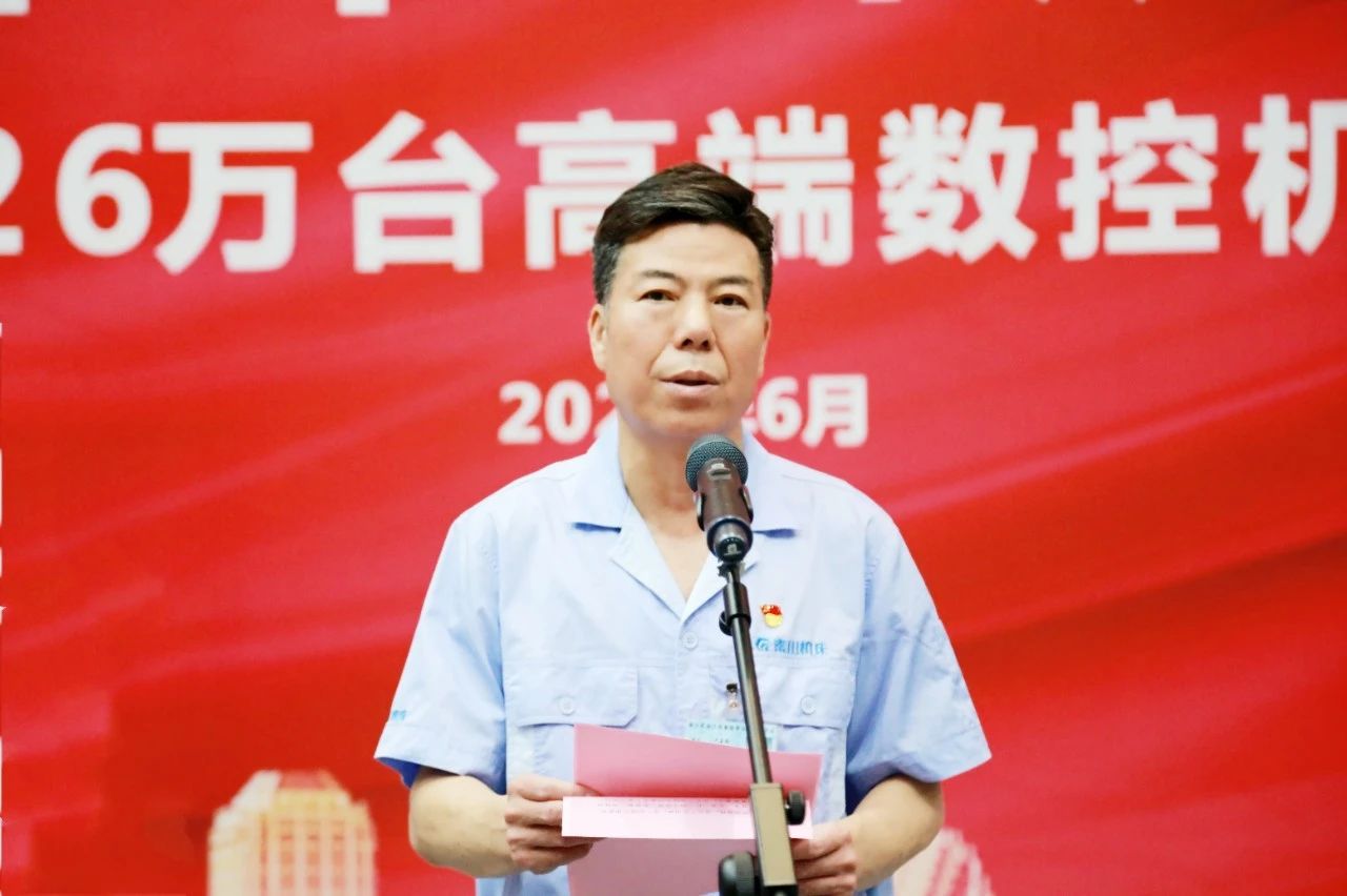 嚴(yán)鑒鉑代表集團(tuán)對(duì)第26萬臺(tái)高端數(shù)控機(jī)床順利下線表示熱烈祝賀!向日夜奮戰(zhàn)在生產(chǎn)一線的集團(tuán)全體員工致以崇高的敬意!